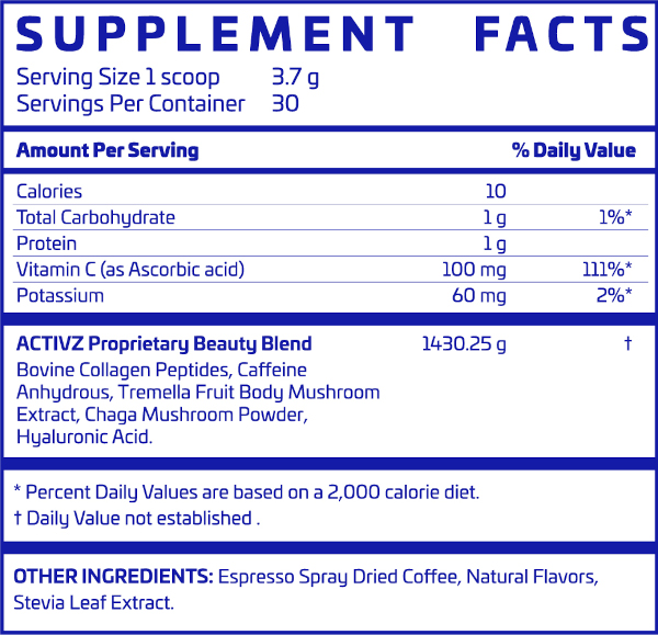 我们的专有配方包括胶原蛋白肽以提供结构与强度,银耳和透明质酸用于深层补水,以及桦褐孔菌以增强免疫力。维生素 C 作为关键激活因子,帮助身体最大化胶原蛋白的吸收与合成,而天然咖啡多酚为你的能量和代谢提供动力。最终形成一套完整的每日仪式,从内而外支持美丽、活力与表现。这不仅仅是咖啡,它是每日 ACTIVZ。